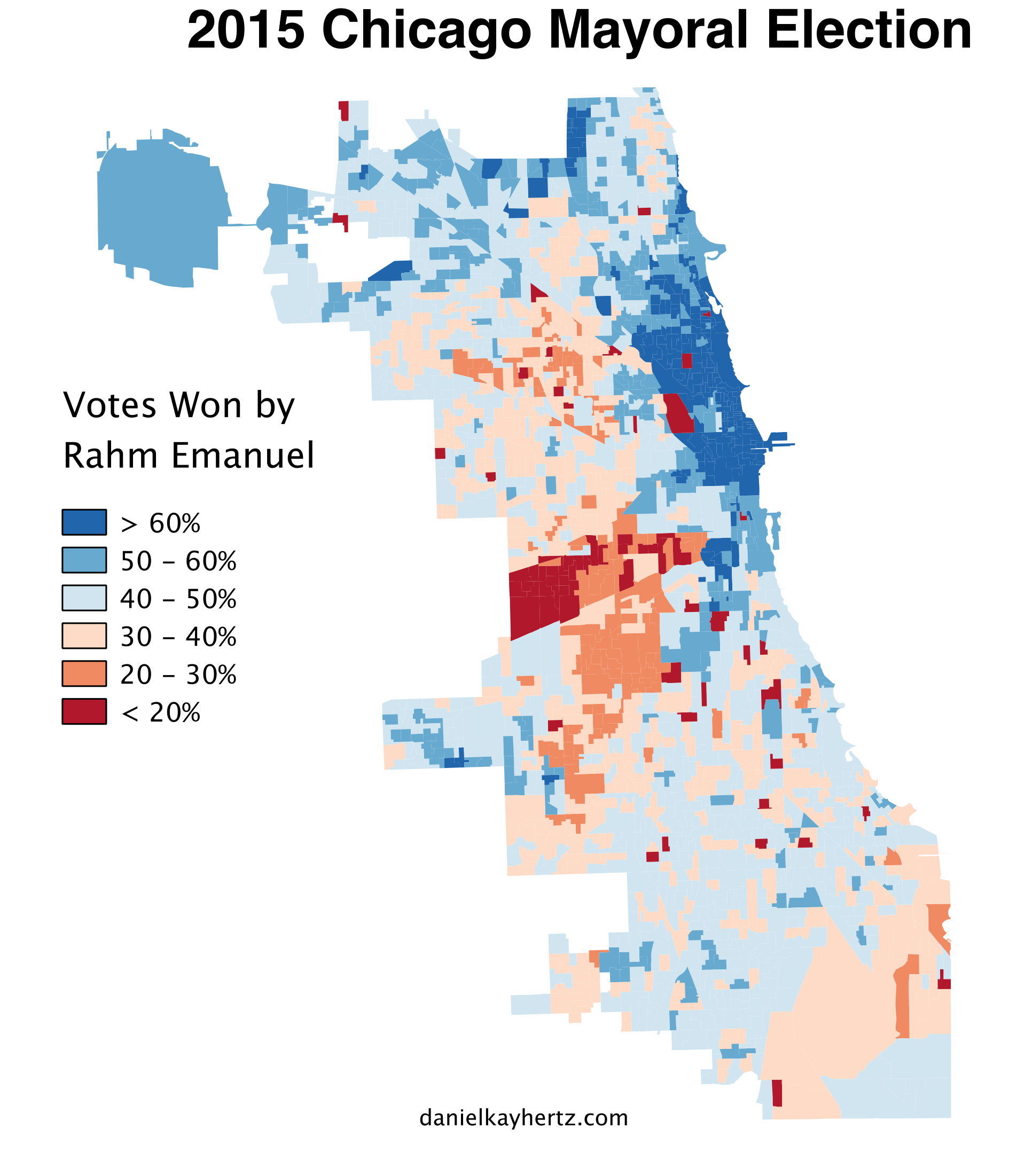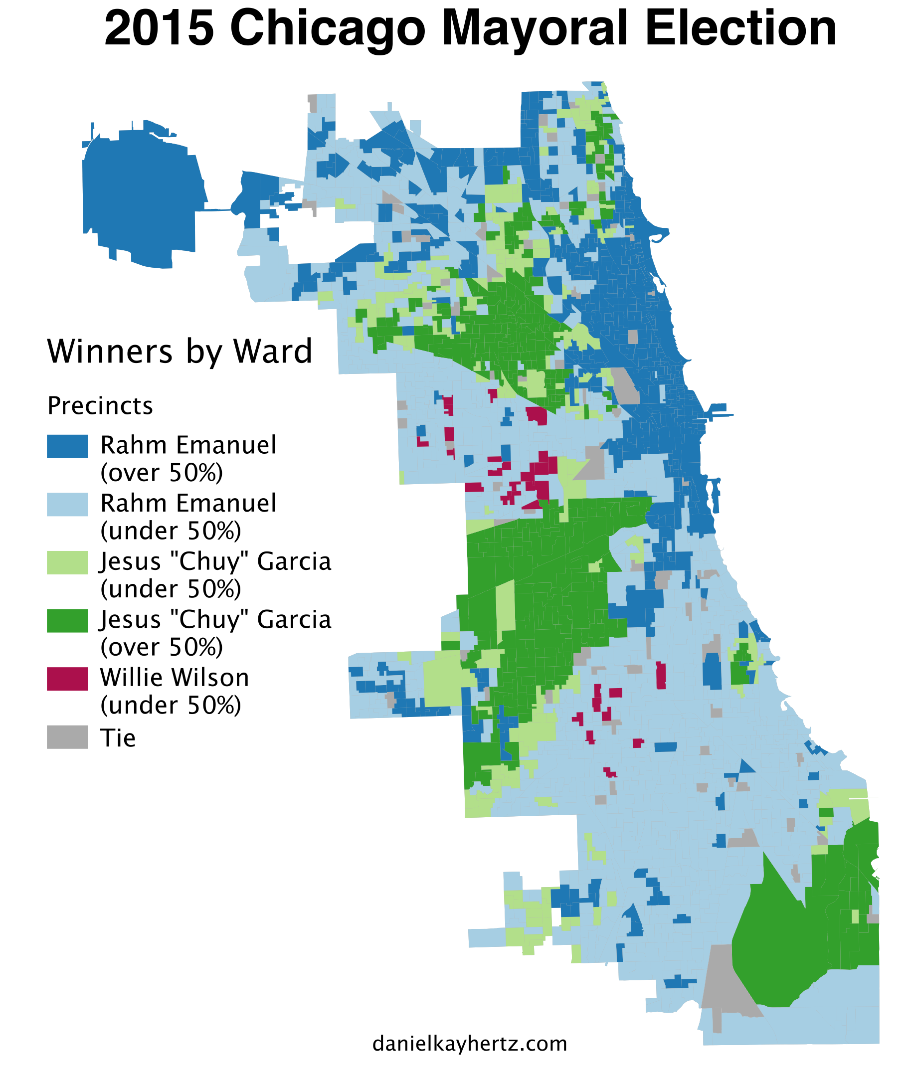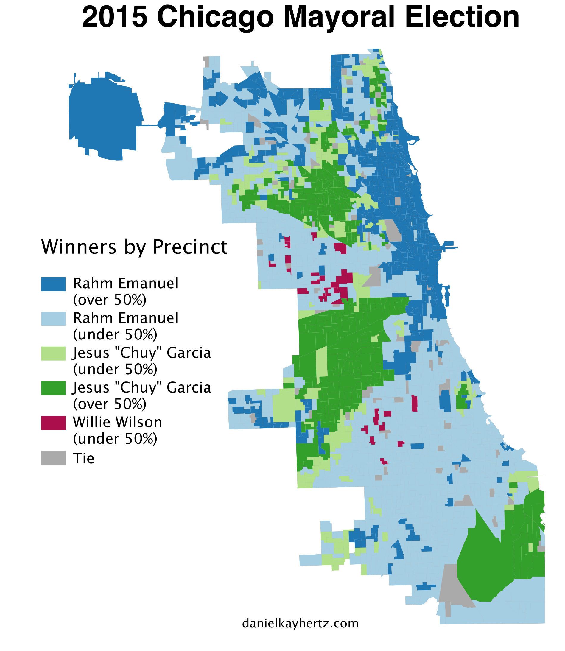 These are by precinct, rather than ward, and so provide a lot more granular detail. I’ve kept all scales and colors the same, except where new categories were required (because Fioretti won a few precincts, but no wards, for example). Thanks to Max Rust of the Sun-Times for the data. Share this: Click to share on X (Opens in new window) X Click to share on Facebook (Opens in new window) Facebook Like Loading... Related
