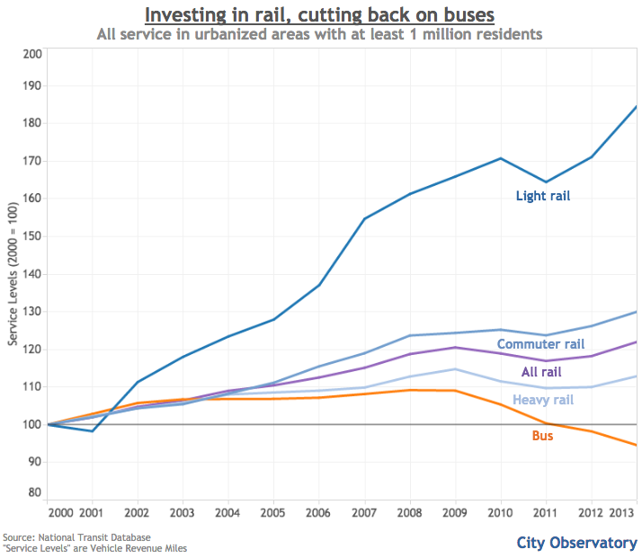And it turns out that when you disaggregate the national data by urban area, there’s a very tight relationship between places that cut bus service between 2000 and 2013 and those that saw the largest drops in ridership. If you live in a city where bus service has been increased, it’s likely that your city has actually grown its bus ridership, despite the national trends. In other words, the problem doesn’t seem to be that bus riders are deciding they’d rather just walk, bike, or take their city’s new light rail line. It’s that too many cities are cutting bus service to the point that people are giving up on it.